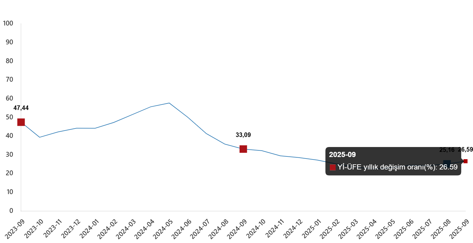 Yİ-ÜFE (2003=100) 2025 yılı Eylül ayında bir önceki aya göre %2,52 artış, bir önceki yılın Aralık ayına göre %23,66 artış, bir önceki yılın aynı ayına göre %26,59 artış ve on iki aylık ortalamalara göre %25,83 artış gösterdi.