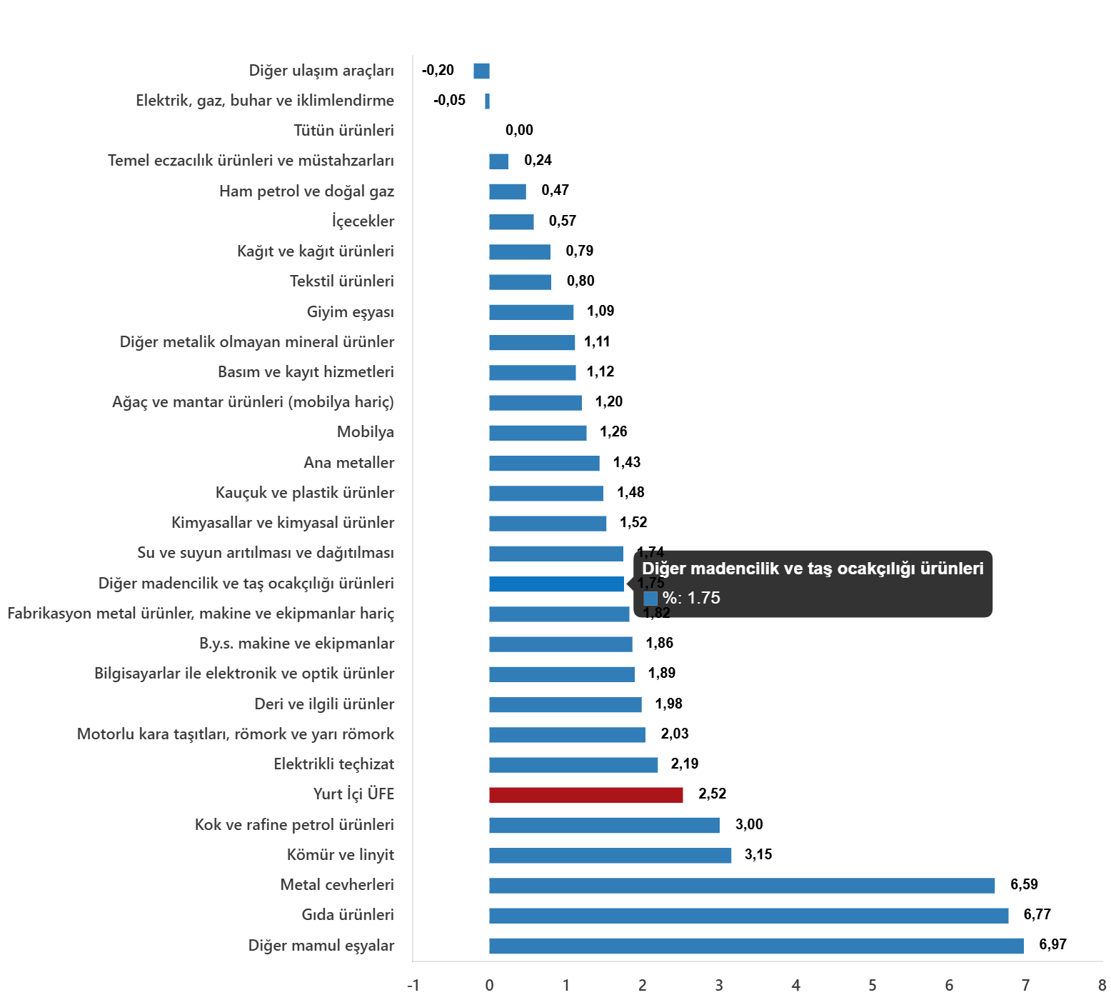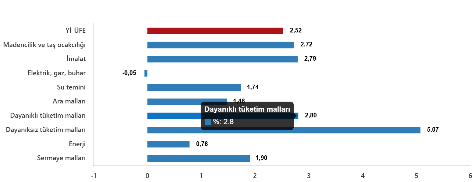 Ana sanayi gruplarının aylık değişimleri; ara mallarında %1,48 artış, dayanıklı tüketim mallarında %2,80 artış, dayanıksız tüketim mallarında %5,07 artış, enerjide %0,78 artış ve sermaye mallarında %1,90 artış olarak gerçekleşti.